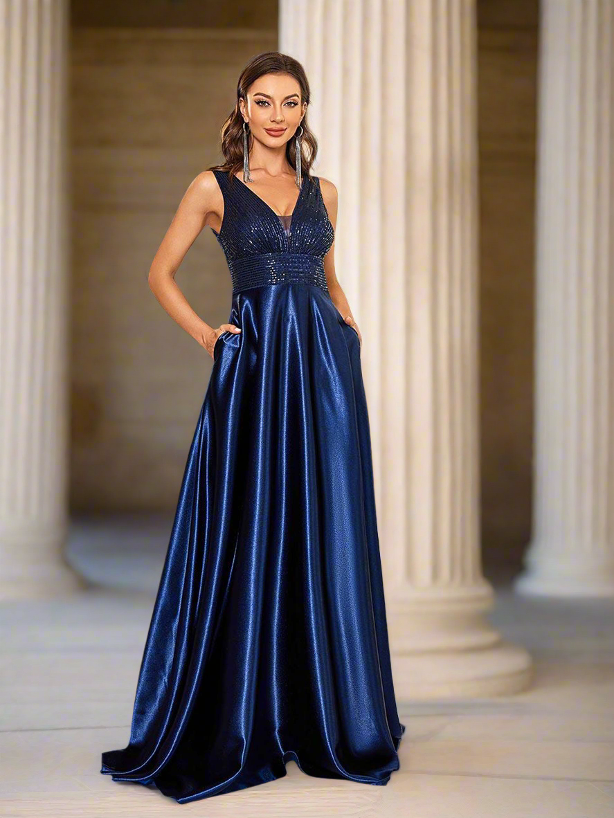 Entdecken Sie dieses elegante, blaue A-Linie Satinkleid mit einem verführerischen V-Ausschnitt und einem rückenfreien Design. Der glänzende Satinstoff verleiht diesem Kleid eine luxuriöse Ausstrahlung. Ein zeitloser Schnitt, der Ihre Figur perfekt umspielt und Ihnen einen verführerischen Look verleiht. Perfekt für besondere Anlässe oder einen eleganten Abend.